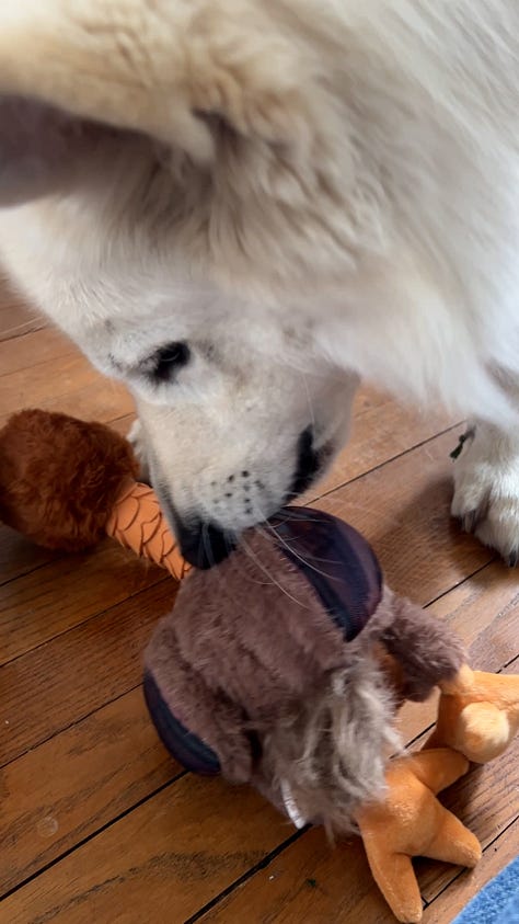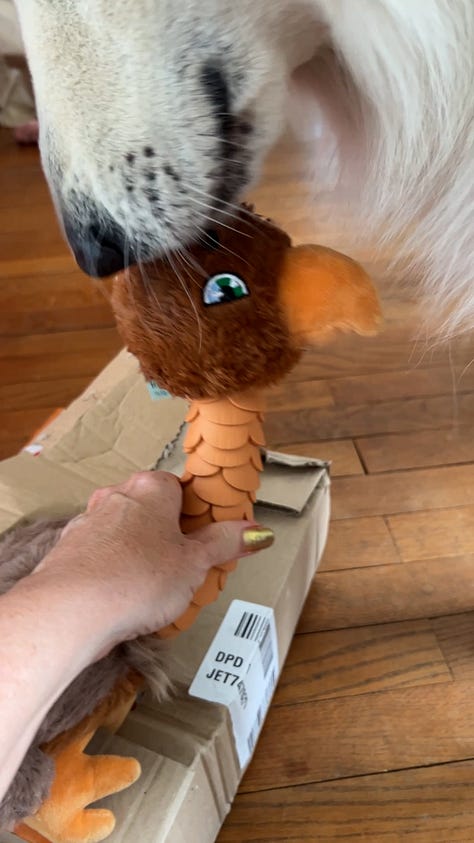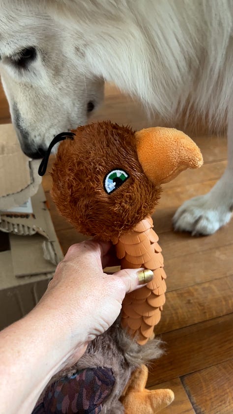 Socks’ new toy, Turkey Jake, from his beloved friend Sheri, has arrived. You’ll see in the full video below that I’m struggling to open the box one-handed while Socks’ nose is already inside, so sorry for the shuffling. He’s been carrying Jake everywhere since, and I’ve been asking him every few minutes, “Where’s Jake?” and praising him inordinately. Notice the soft, soulful look in Jake’s eyes — true love in plush form, and with a chewy rubber neck. But wait. Is Jake a turkey?