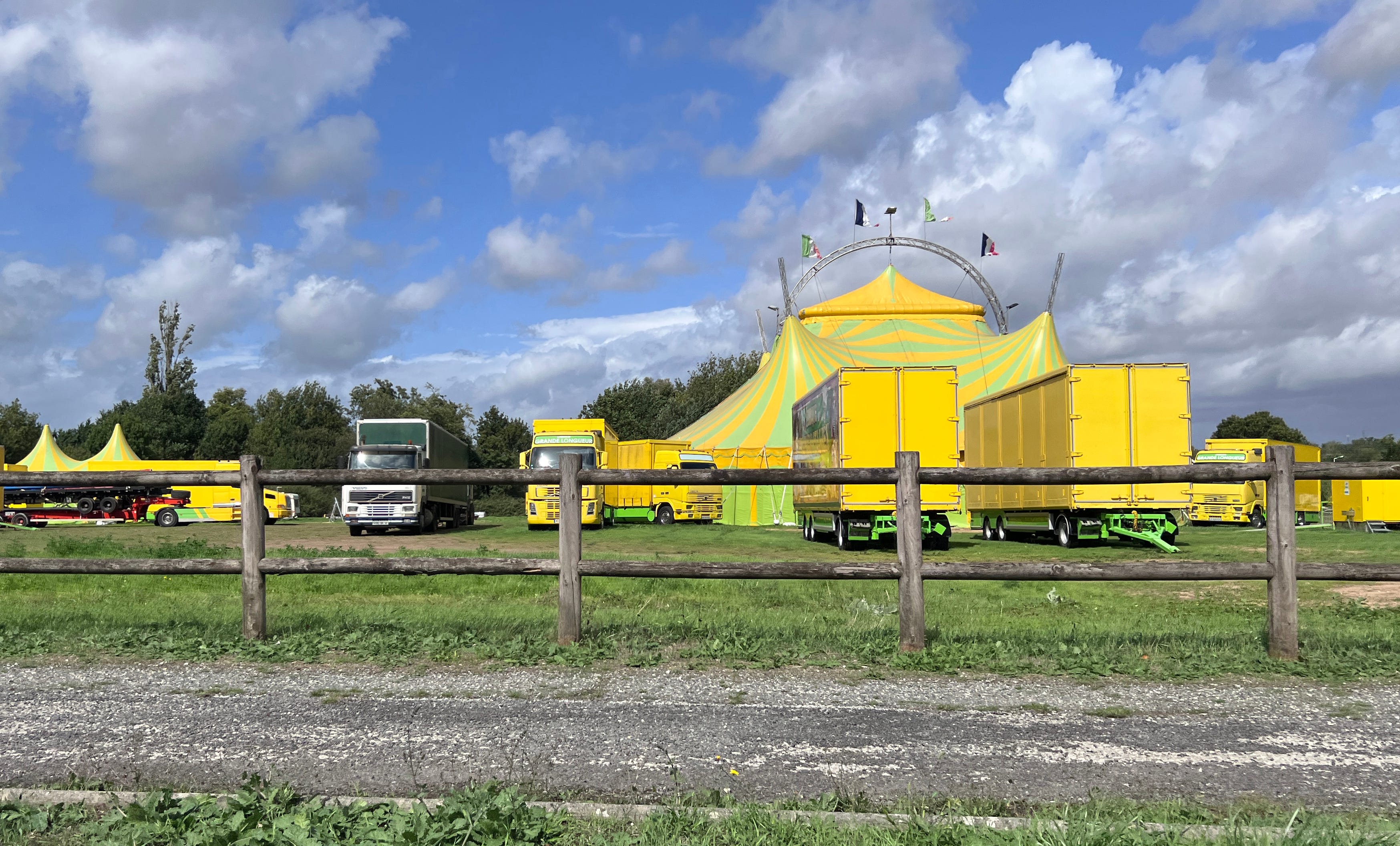 Driving away, I noticed a circus being set up in the distance. Bright banana-yellow trucks lined the field, so perfect they looked staged.