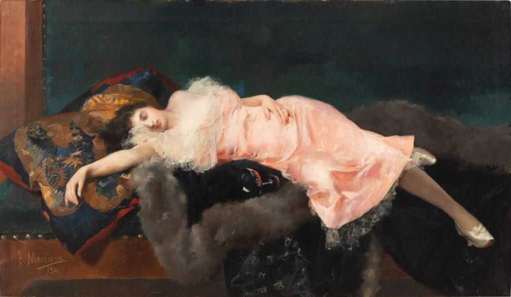 A languid study in romantic decadence and full-bodied sensuality. Draped across the fainting couch with the confidence of a 19th-century salon muse, this work recalls Francisco Masriera y Manovens’ A Woman Lying on a Couch—only furrier, and arguably more self-aware.